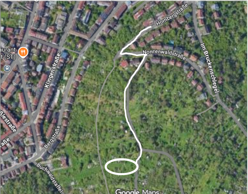 Hornbergstr. bis ans obere Ende, dann scharfe Linkskurve und nach 40 m Nonnenwaldstr., rechts den steilen Stich am Mammutbaum vorbei, oben 150 m geradeaus (nicht nach links abbiegen!) Richtung Buchwald – bis rechts unser neugebautes Regenwasserdach zu sehen ist: